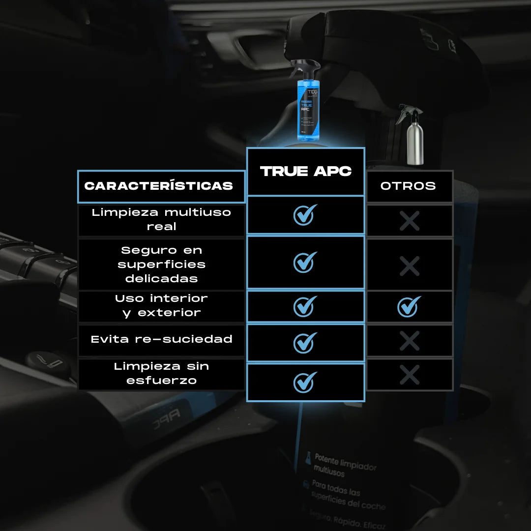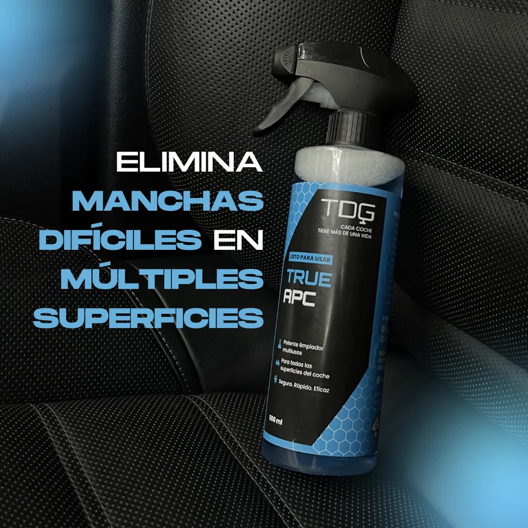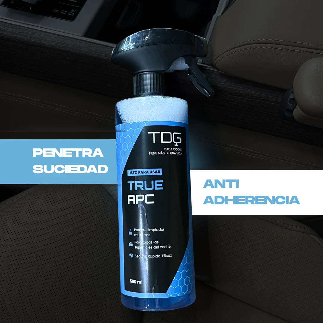 TRUE APC es un limpiador multiusos de alto rendimiento, diseñado para eliminar eficazmente suciedad, grasa, aceite y contaminantes en superficies interiores y exteriores del vehículo.